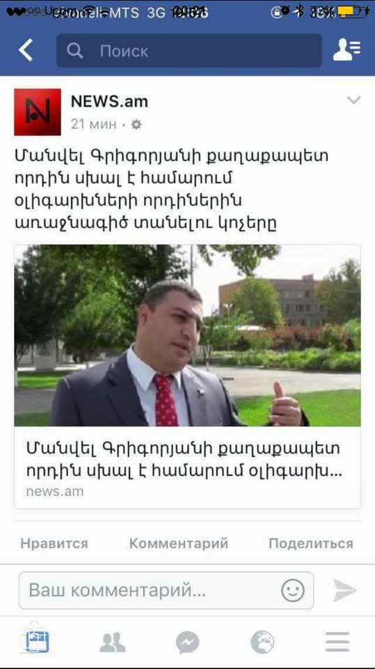 «Խոսքի ազատությունը մանրադրամի փոխարինող և պատվերակատար «լրատվամիջոց»։ Ցավում եմ,բայց պիտի հաշտվես,որ օրենքով սահմանված կարգով,պիտի պատասխան տաս։Խեղաթյուրելու,լրագրողի էթիկան ոտնահարելու և վերջապես,թշնամանք տարածելու համար։
